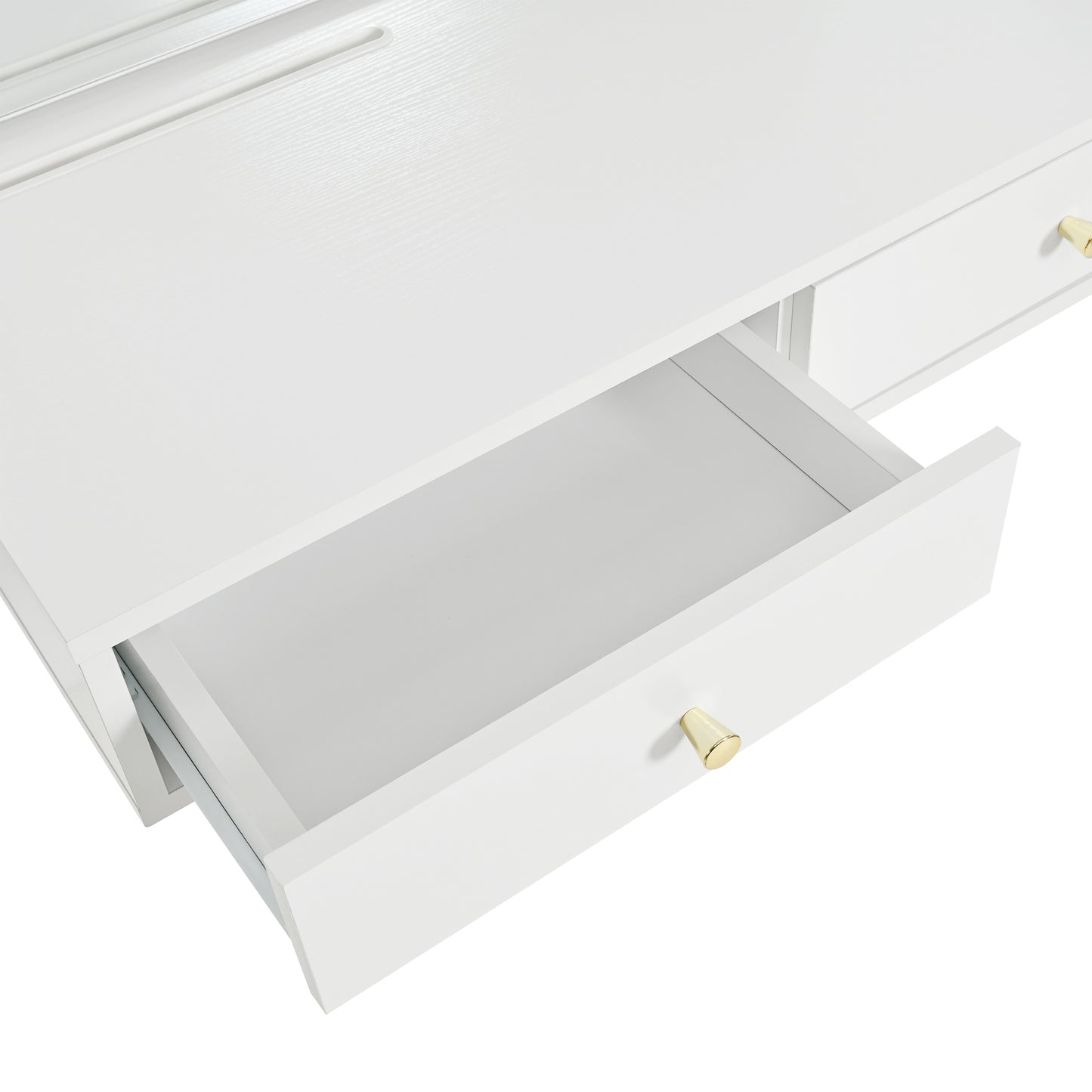 - Ample Storage for Organization: Equipped with two large drawers, this dressing table provides ample space for storing cosmetics, jewelry, and accessories. The top panel includes convenient holders for your phone, tablet, hairdryer, and makeup brushes, keeping everything within easy reach.