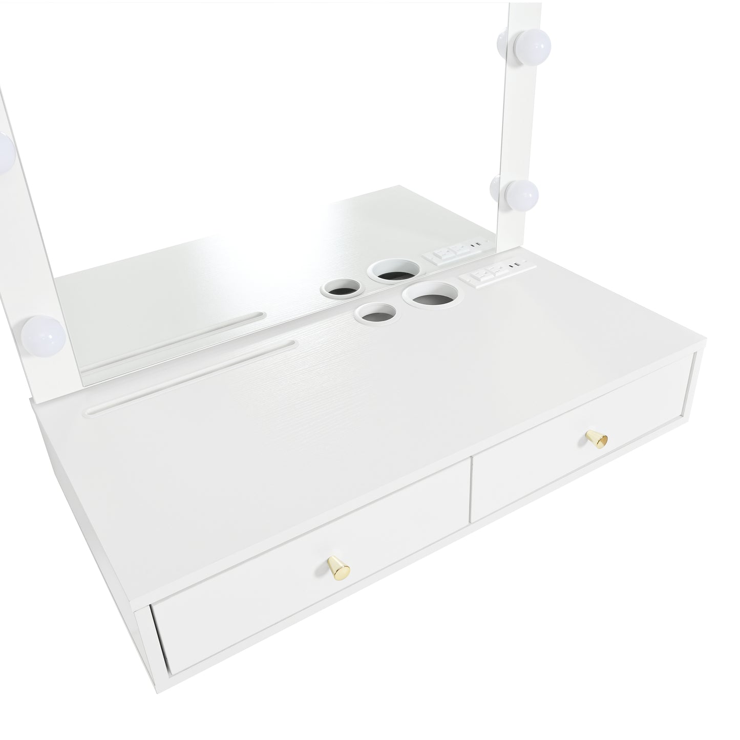 - Convenient Charging Port: A charging port with 1 USB, 1 Type-C, and 2 outlets is conveniently located on the side of the table, allowing you to charge your mobile phone, hairdryer, and other devices while using the vanity.