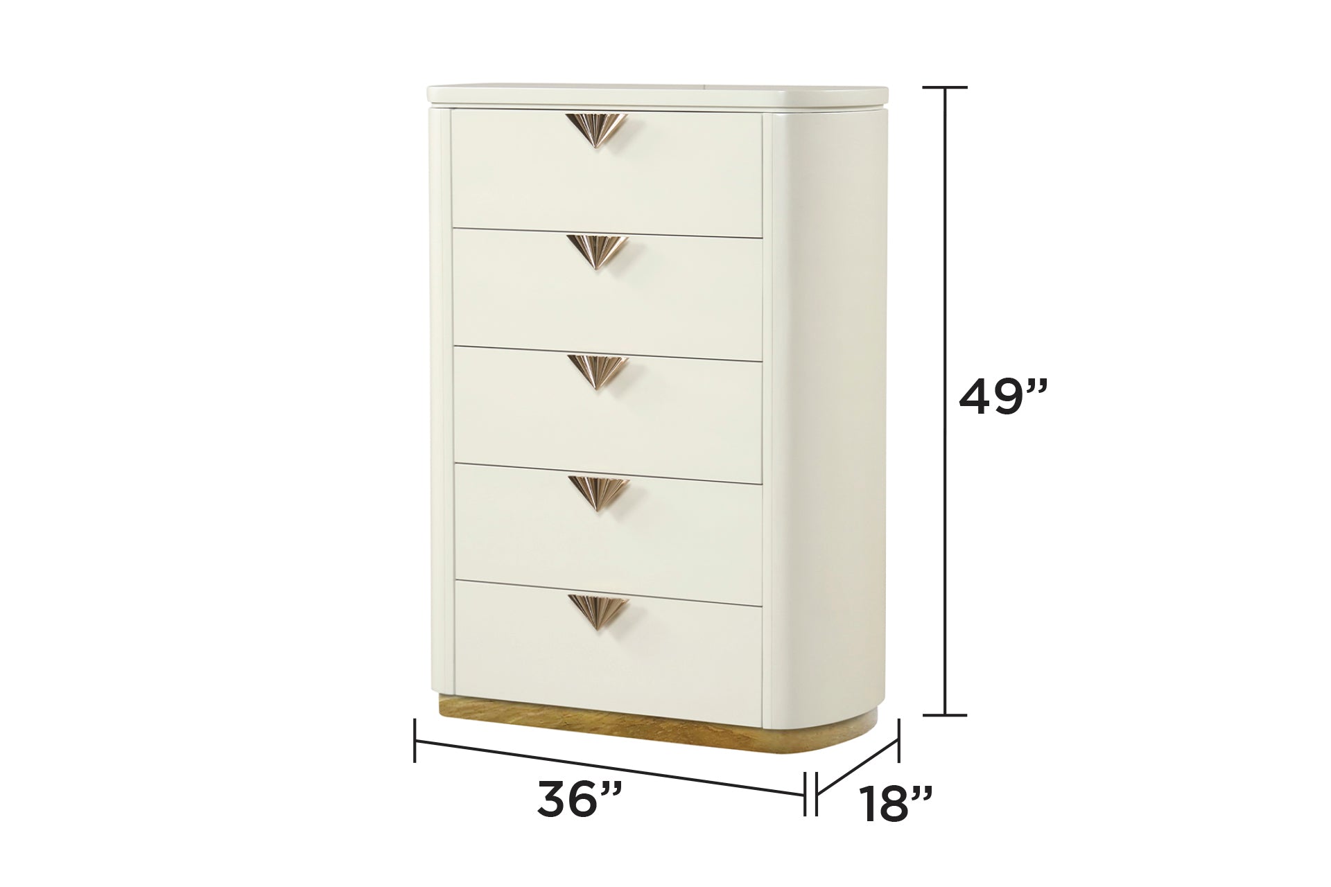 Elevate your bedroom with the luxurious 5-piece set, offering everything in the 4-piece set plus a spacious chest. This collection is designed with modern elegance in mind, featuring high-gloss finishes, metallic accents, and practical storage solutions. The dresser, nightstand, and chest provide ample storage with soft-closing drawers and metallic handles that stand out in style. The illuminated mirror enhances the room's atmosphere, reflecting light and adding depth to your space. This set is ideal for those looking to combine sophistication with functionality in their bedroom.