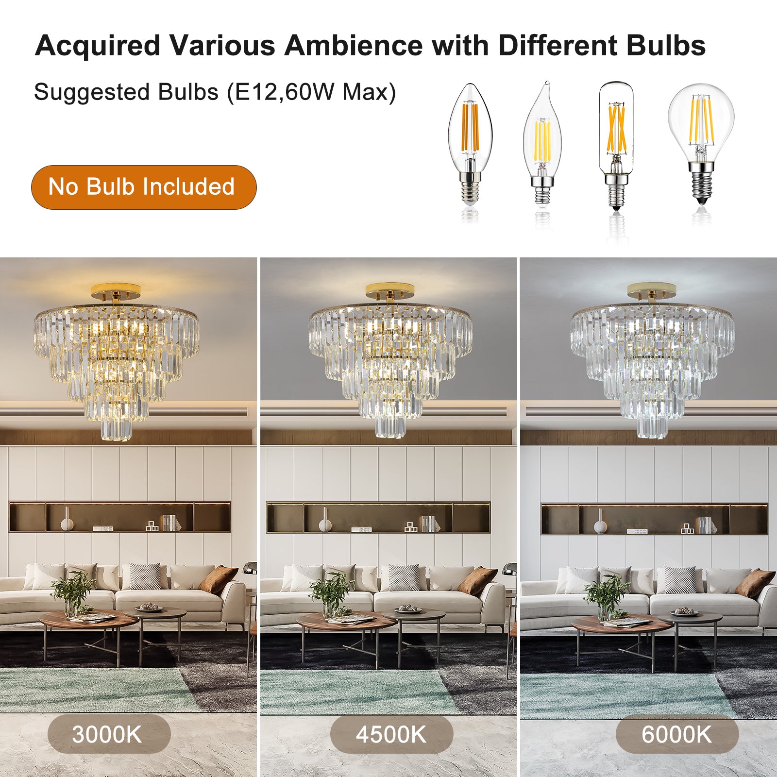 - Bulb requirements -Modern ceiling chandeliers use 10 x E12 bulbs, compatible with dimmable bulbs, energy-saving bulbs, LED bulbs, Halogen lamp, etc.(Excluding)