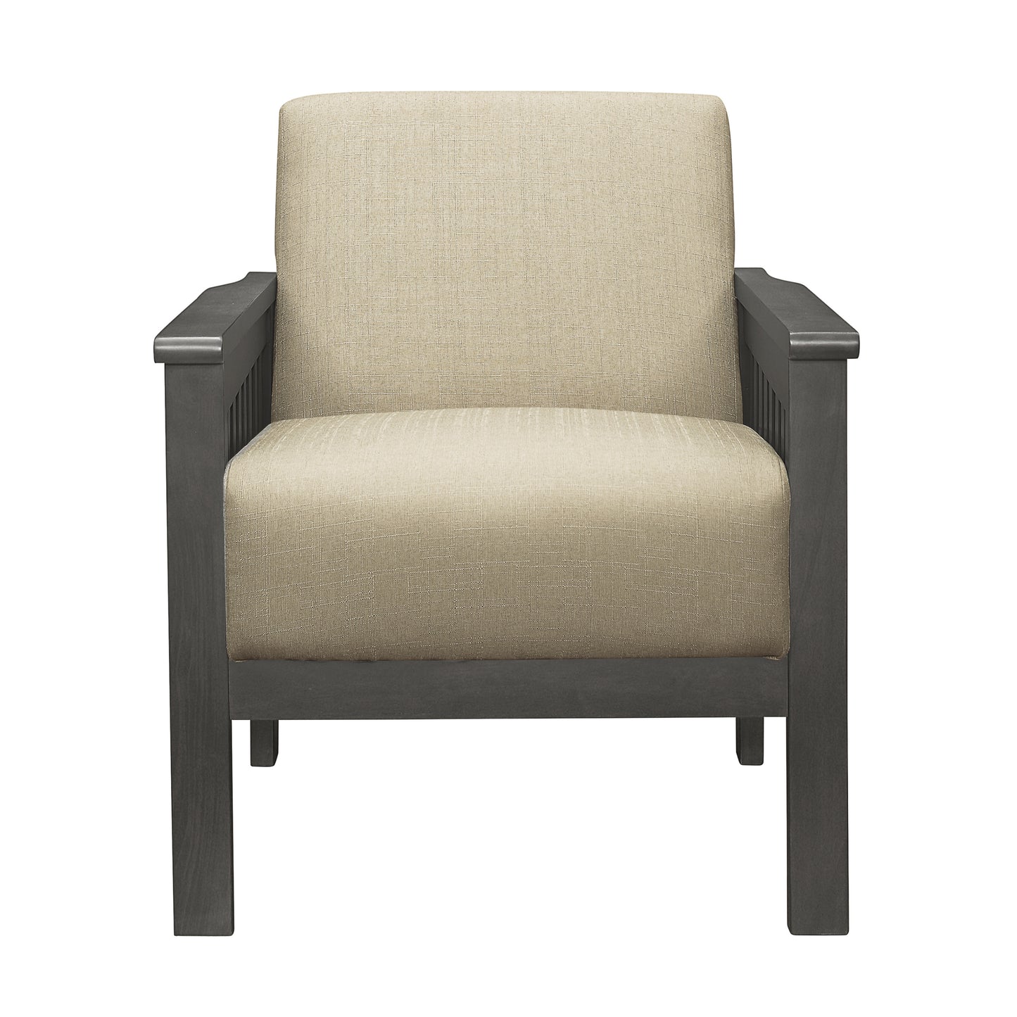 Designed with inspiration from the Arts & Crafts movement, the Lewiston Collection will be a classic addition to your home’s décor. The chair's transitionally styled legs and vertical slat-supported wood arms are finished in an antique gray, providing complementing contrast to the brown linen-like fabric covering.