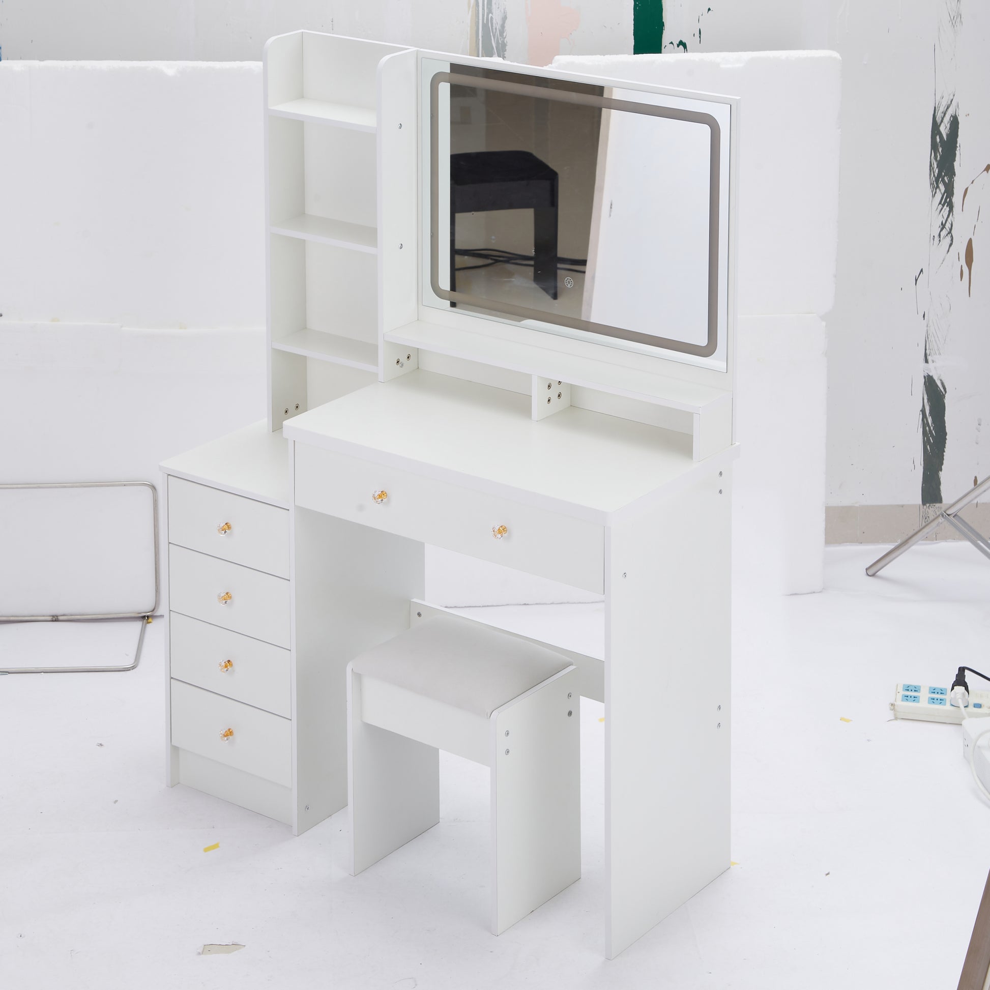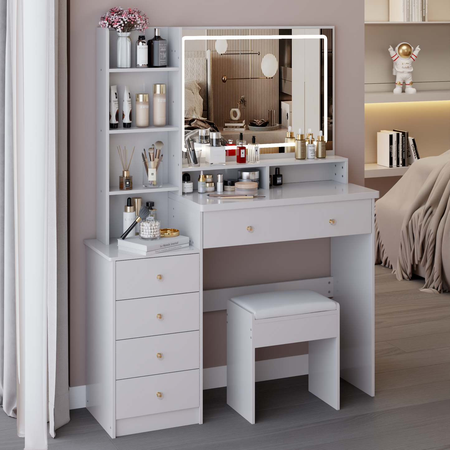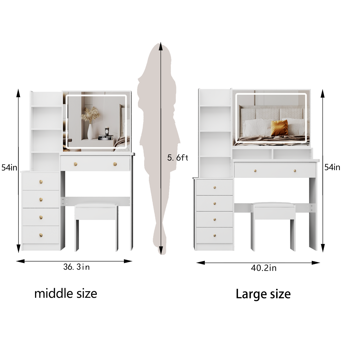 41' Large Size Left Bedside Cabinet Vanity Table+Cushioned Stool, Extra Large Touch Control LED Mirror, 3-color Switch, Multi Layer High Capacity Storage Fashionable Dresser, Suitable For Large Space