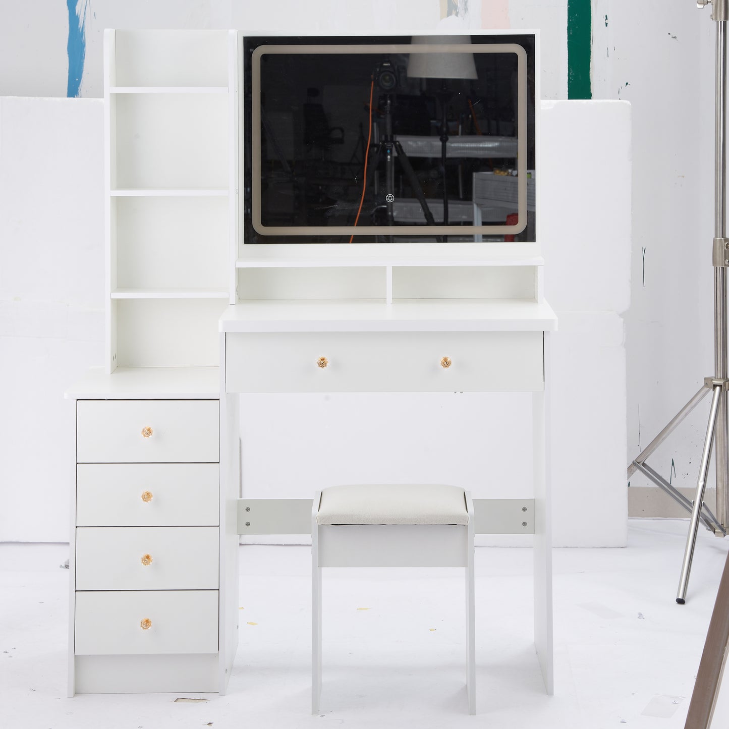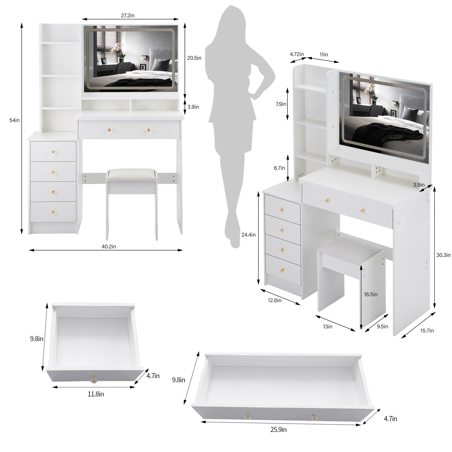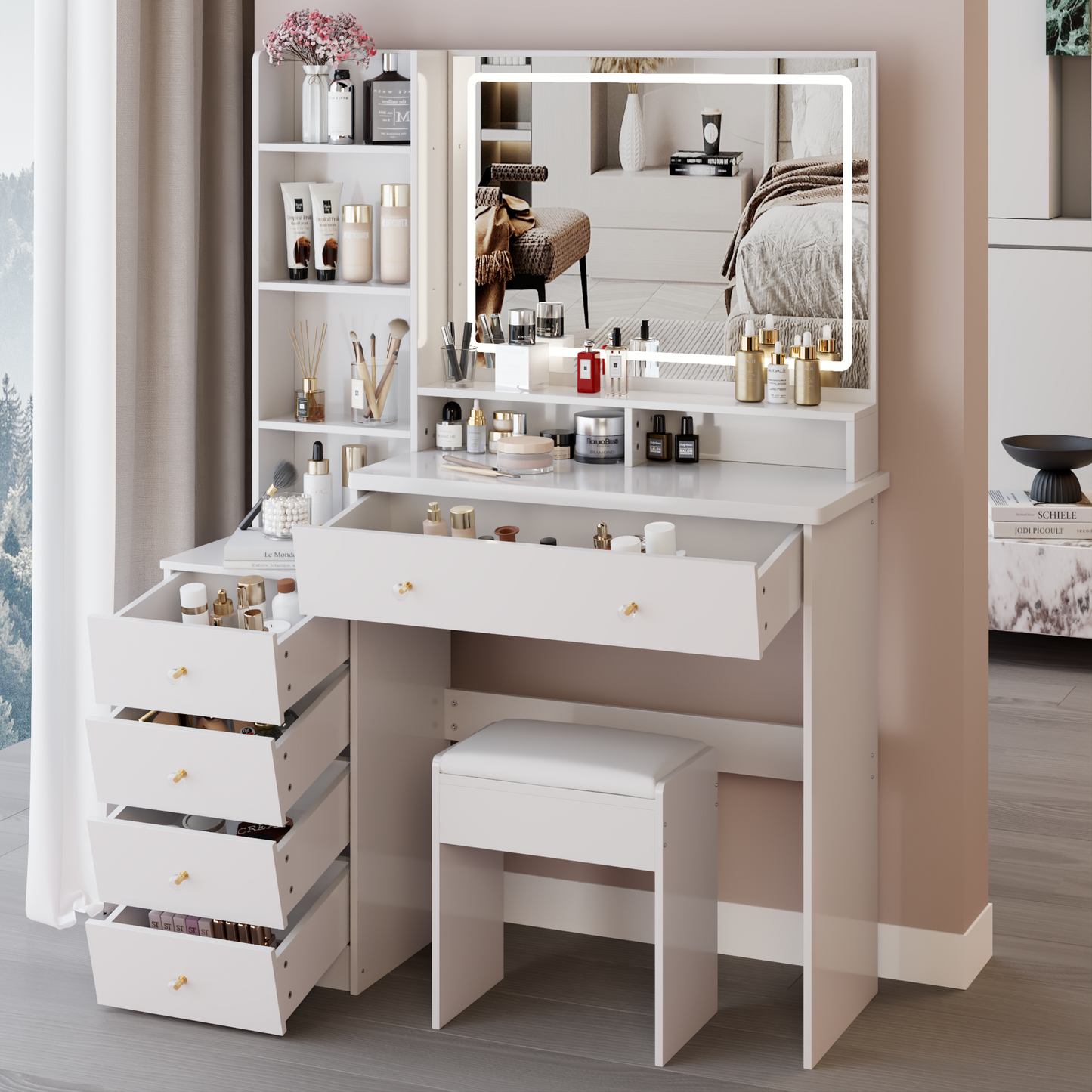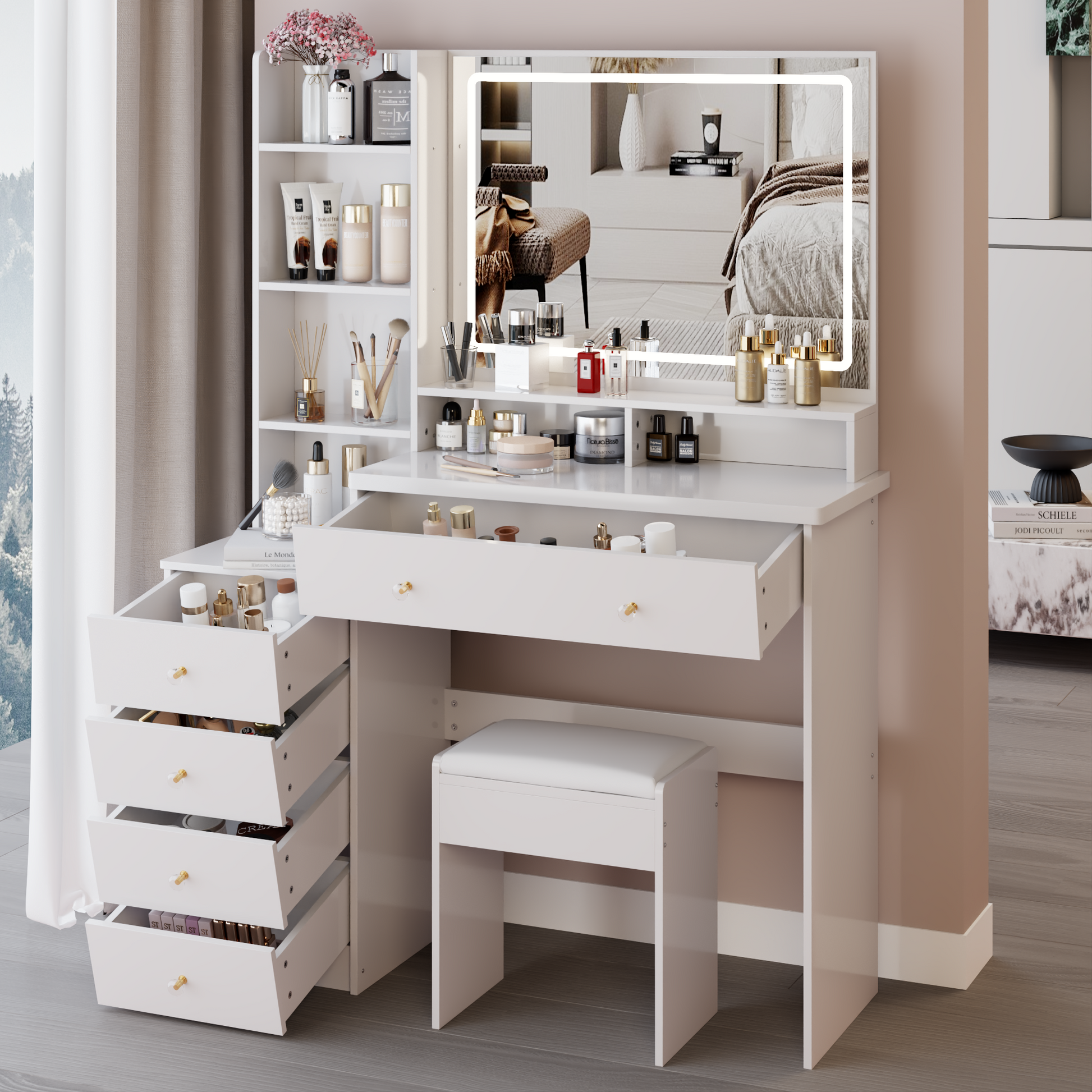 41' Large Size Left Bedside Cabinet Vanity Table+Cushioned Stool, Extra Large Touch Control LED Mirror, 3-color Switch, Multi Layer High Capacity Storage Fashionable Dresser, Suitable For Large Space