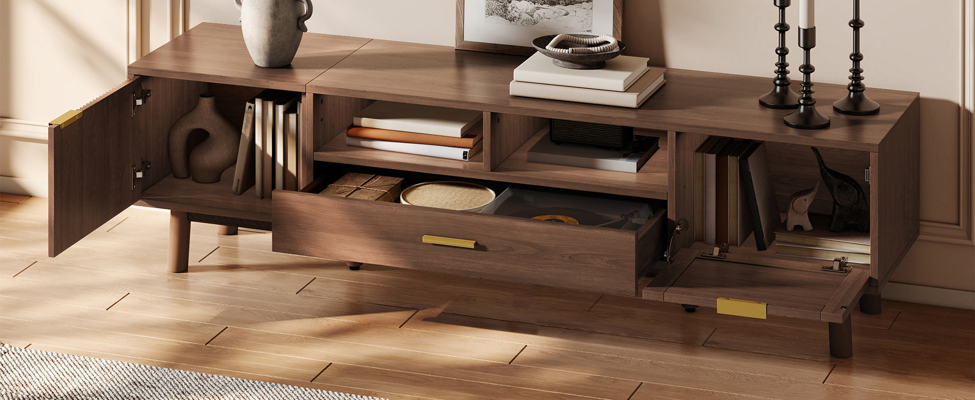 Upgrade your living space with this elegant and functional TV stand, designed to enhance both style and convenience. Featuring beautifully crafted interwoven rattan drawers and solid wood legs, this piece adds a touch of natural sophistication to any home decor. The smooth, waterproof surface ensures durability while making cleaning effortless. With its soft-close cabinets, spacious drawers, and convenient drop-down storage, this TV stand keeps your entertainment area organized and clutter-free. Whether your style is modern, rustic, or coastal, this versatile piece blends seamlessly while providing the perfect storage solution for your media essentials. A perfect combination of beauty, practicality, and lasting quality.