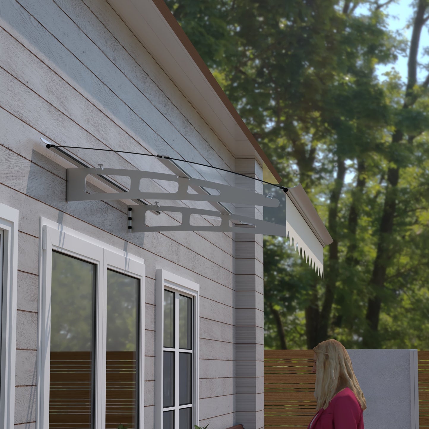 5934W Series Door Window Awning Canopy W59'xD34' Made of 0.137Inch /3.5mm Thick Virtually Crystal Solid Polycarbonate Sheet with Polyester Valance for Wooden House.