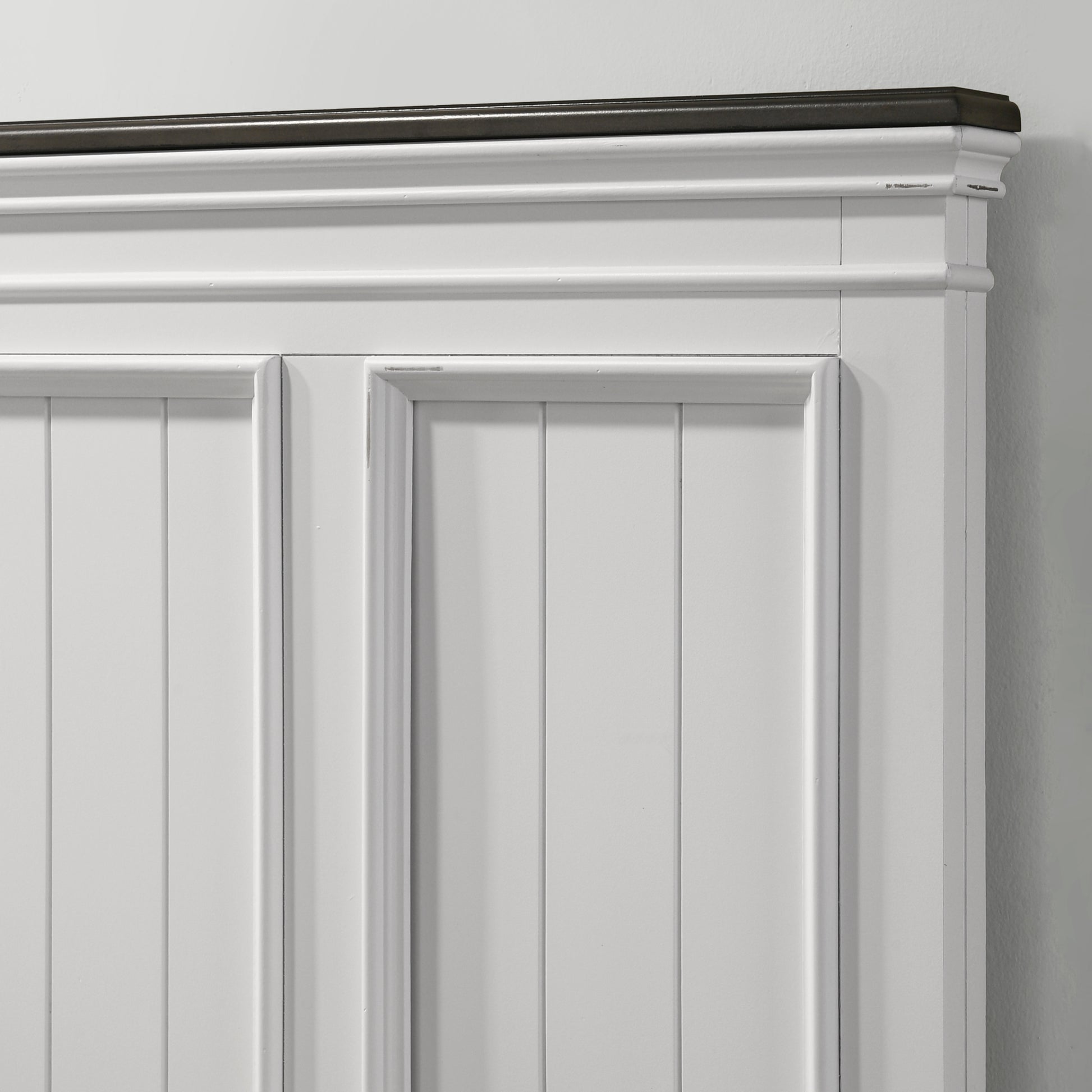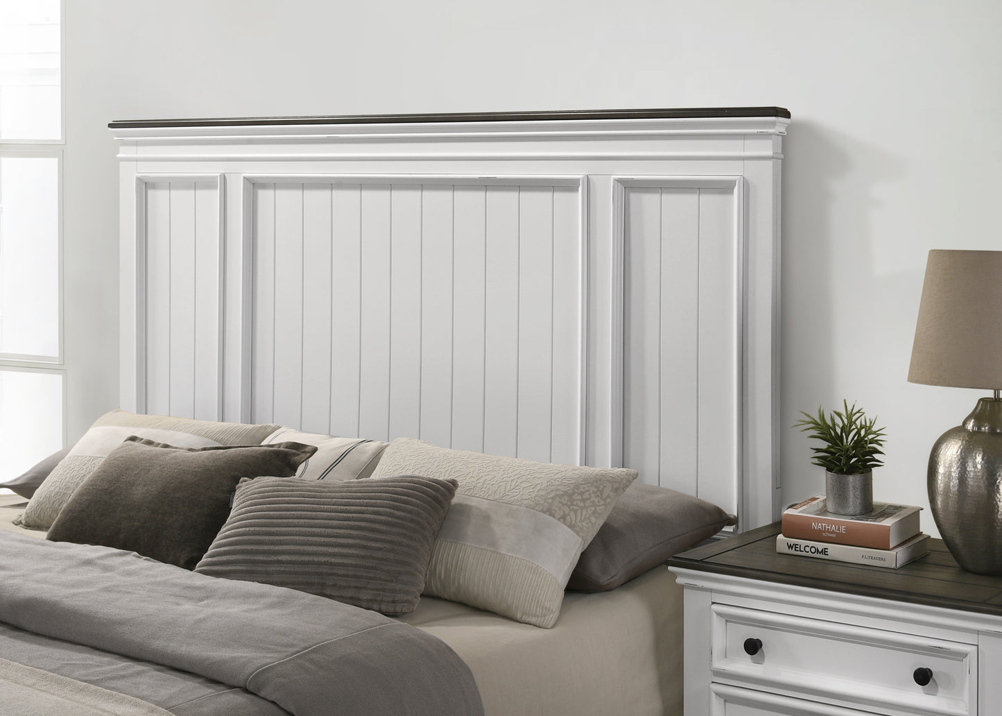 Contemporary shiplap detailing and a weathered white finish mean this Clelane Wood Bedroom Set will give your bedroom a fresh new look. A stylish bed, this one is made of solid tropical wood and laminate with Okumin veneers in a charming weathered white finish. Chic shiplap panels inside carved details with trim molding on the headboard and footboard. The distressed mark, delicately carved trim, and black finished hardware brings a touch of modern farmhouse style to this set. English dovetail drawer construction with full extension metal ball bearing drawer glide.