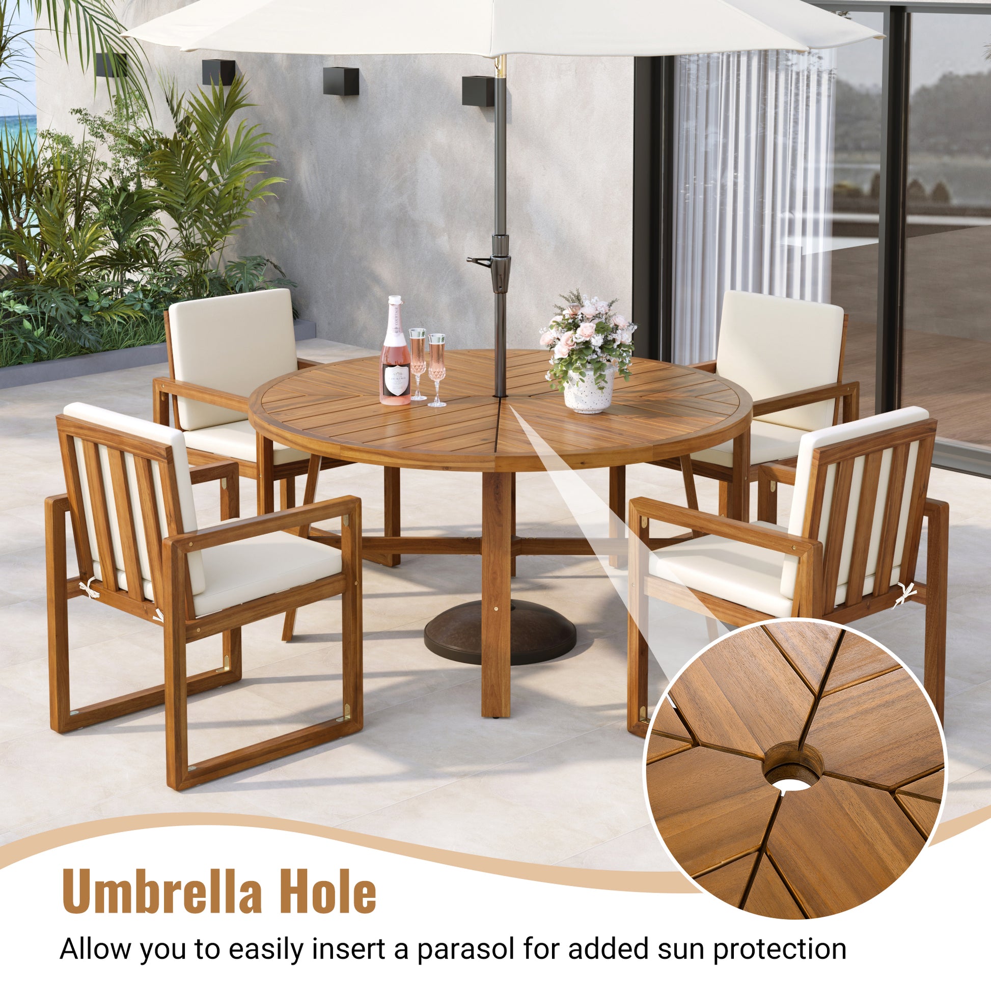 This 5-piece outdoor dining set offers the perfect blend of durability, comfort, and style. Made from solid acacia wood, it features a round table with a 2-inch umbrella hole for all-weather convenience (umbrella not included). The four matching armchairs include plush, removable cushions with water-resistant covers for easy maintenance and enhanced comfort. A modern slatted design and sturdy frame provide both visual appeal and reliable support, making this set a stylish and functional addition to any patio, garden, or backyard space.