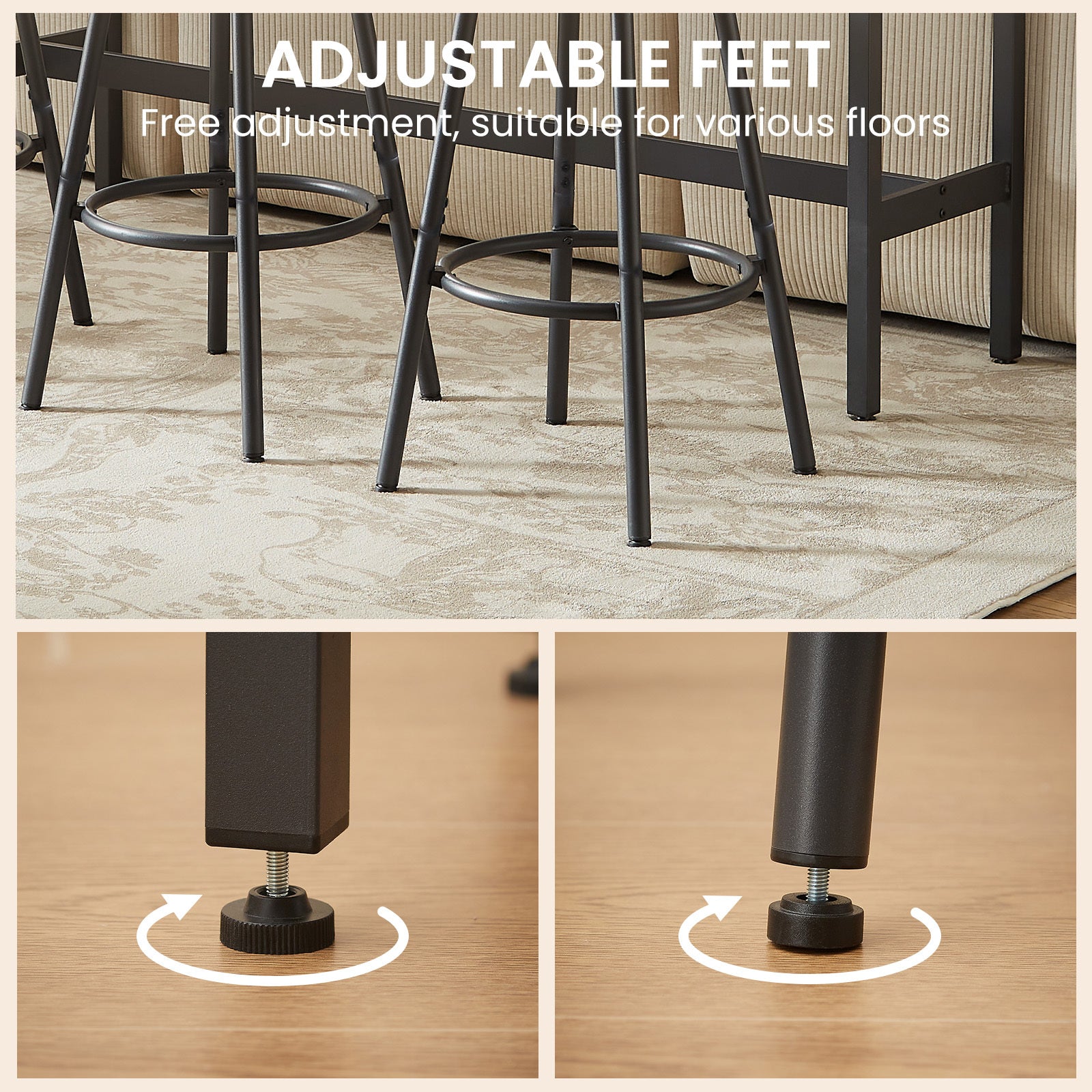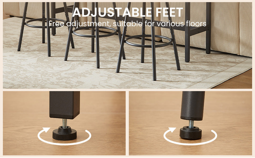 - Keeping it Smooth: Tables and stools are equipped with foot pads, which can be adjusted to improve balance and maintain stability even on uneven floors, as well as preventing scratches on the floor.