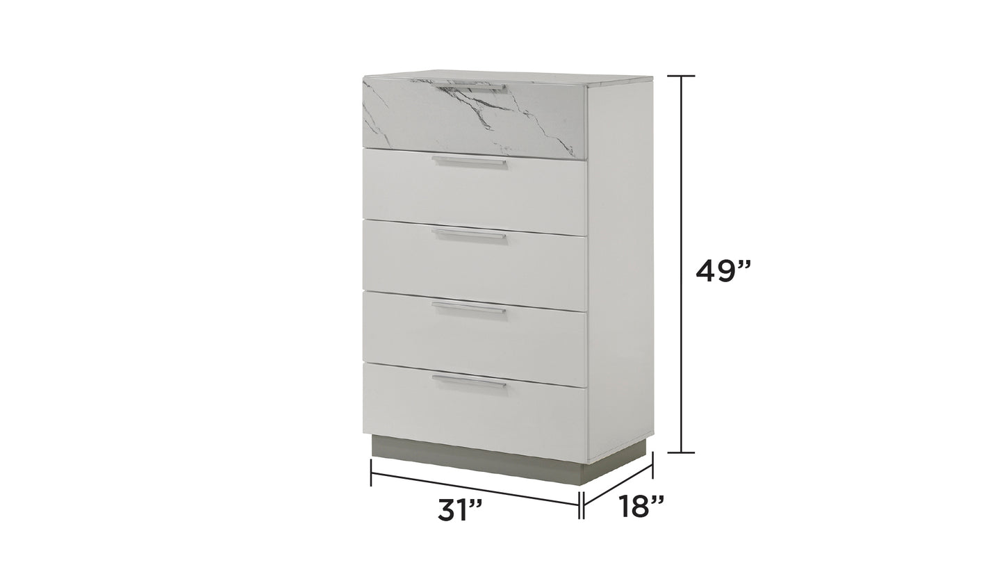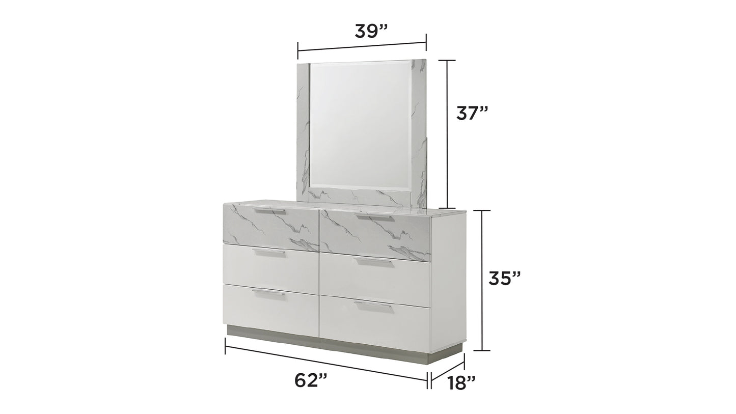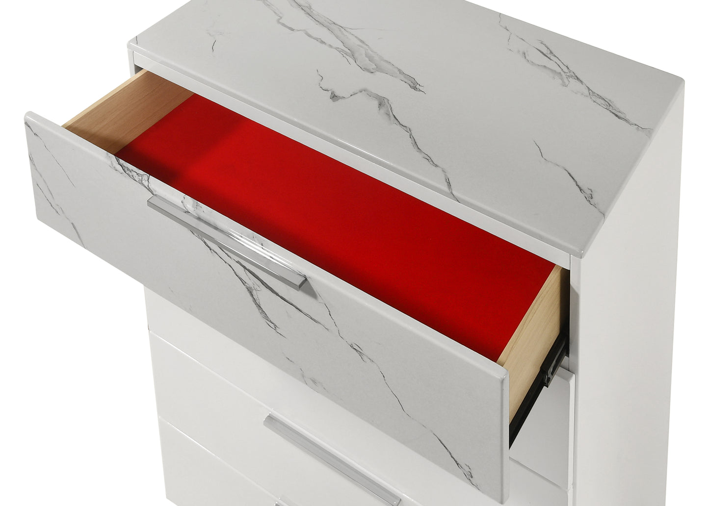 - Two-Tone High-Gloss Marble and Lacquer Finish: The luxurious marble-patterned surfaces on the bed, dresser, nightstand, and chest elevate the overall aesthetic.