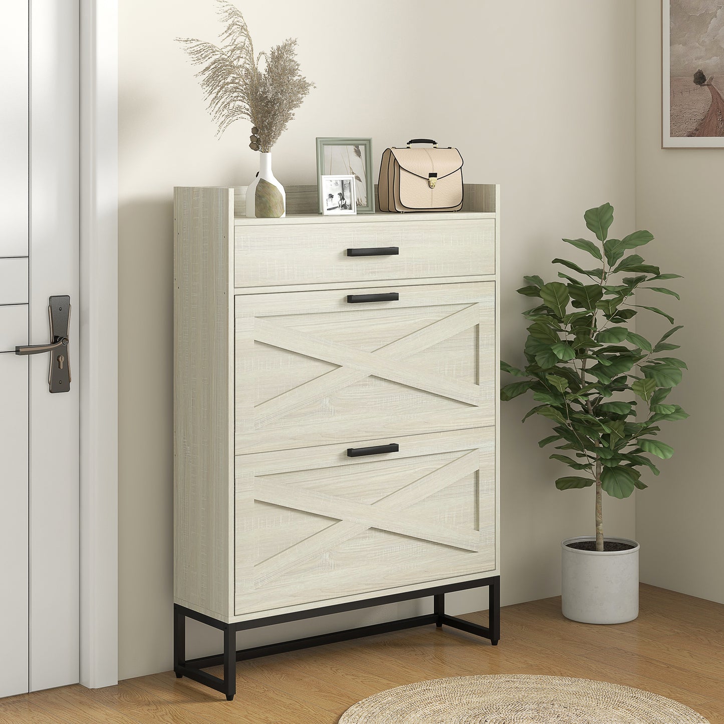 - Practical & Space-Saving: The compact design of this shoe cabinet fits in spaces such as hallways. The 2 flip drawers and a top drawer have metal handles that make accessing your shoes easy.