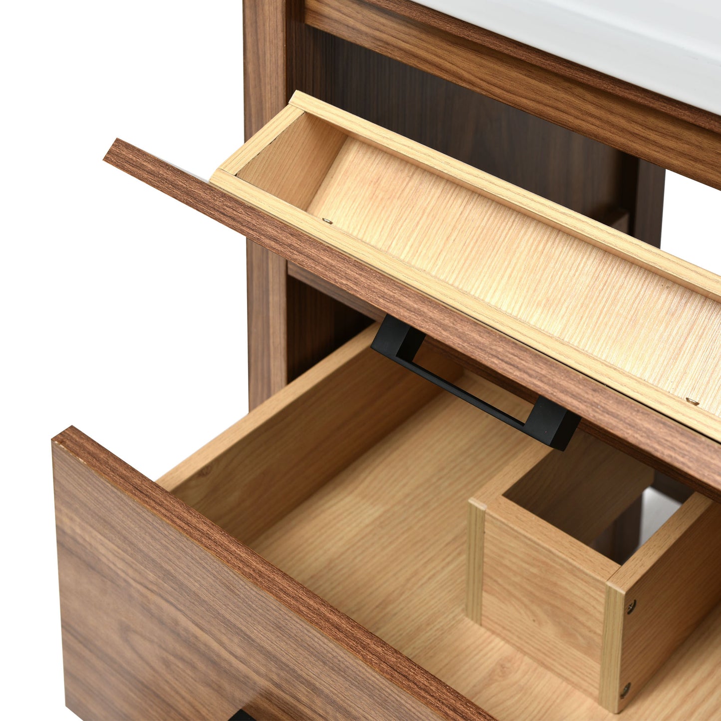 - If you need a bathroom vanity that is exquisite, compact and functional, choose this one! We configured three storage drawers for this 24-inch bathroom cabinet. The tip-out drawer makes clever use of the free area under the basin, and you can put small objects in it, which is very convenient to take. U-shaped drawers and traditional large drawers maximize the use of cabinet space and can perfectly accommodate your daily toiletries. And these closed storage spaces can prevent your favorite thing