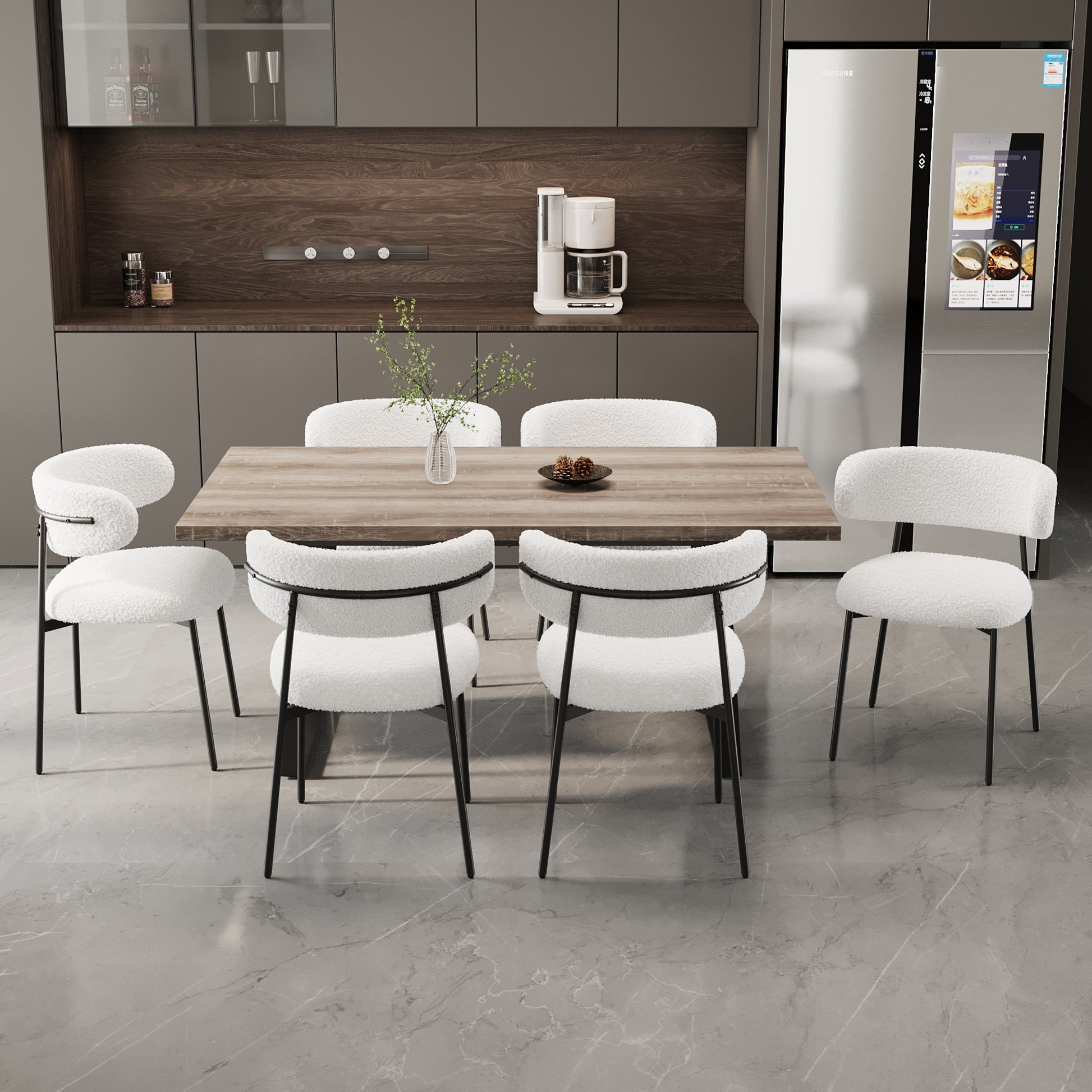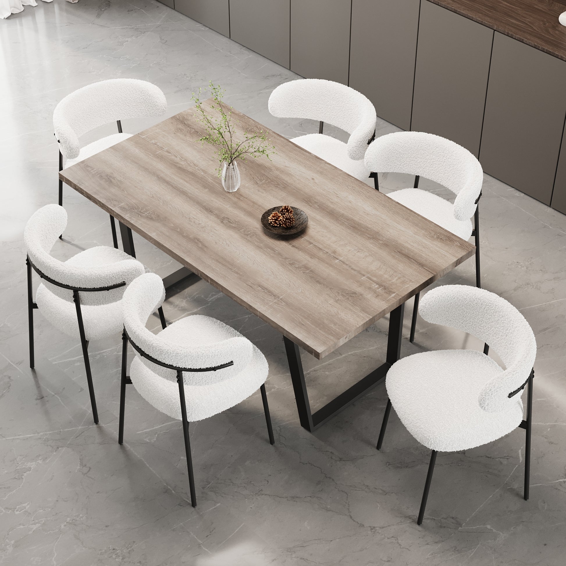 - 2.Ideal choice for warm family gatherings: This 4-6 person dining table set, paired with six white teddy plush chairs, adds a touch of warmth to your family gathering. The soft seats provide you and your guests with unparalleled comfort while enjoying delicious food.