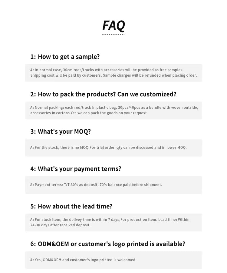 1.Each track/rod in a polybag, 20 or 40 pcs as bundle with woven bag outside. 2.Accessories packed in a polybag separately with carton outside(25*25*45cm or 36*36*36cm)
